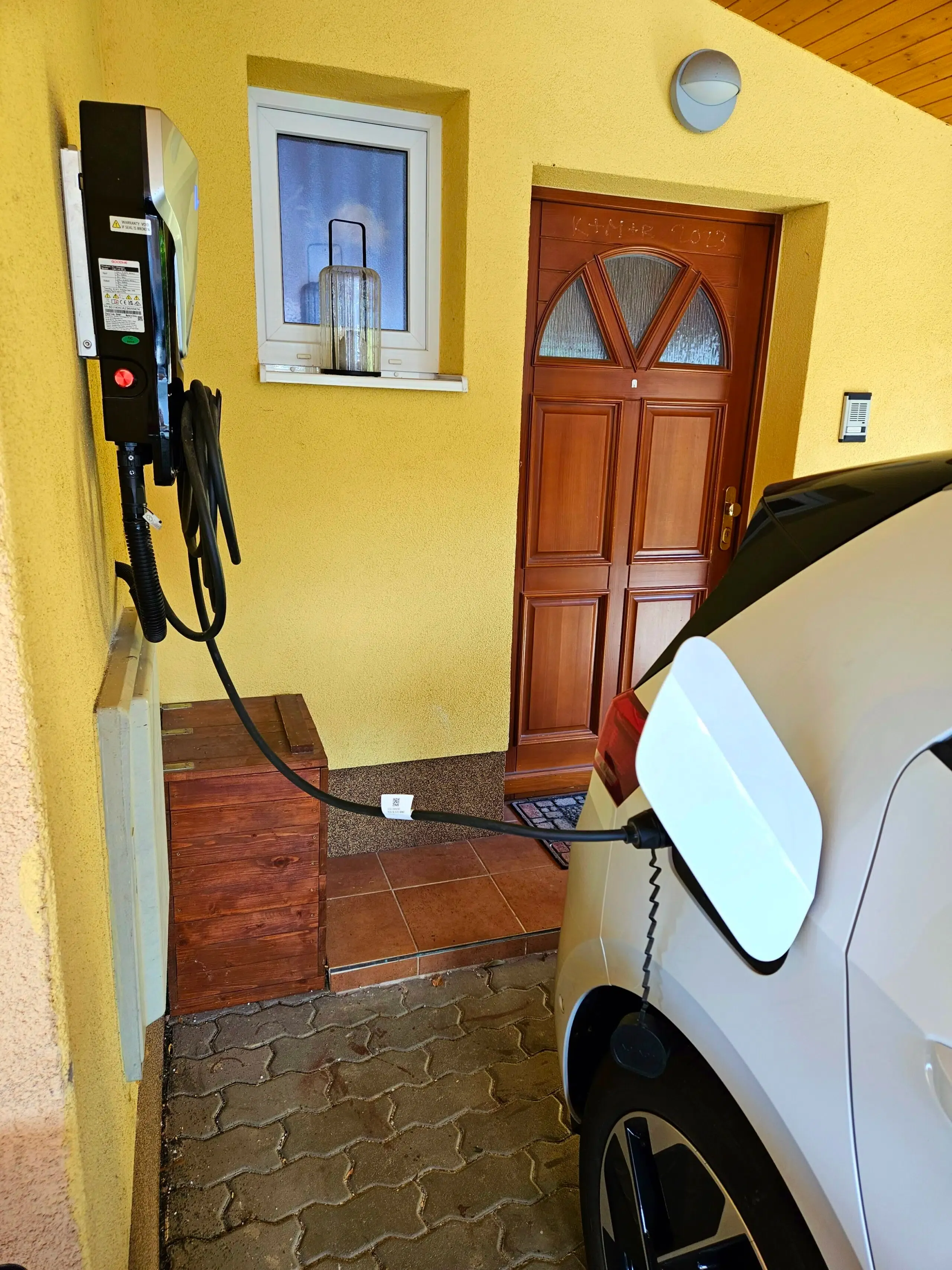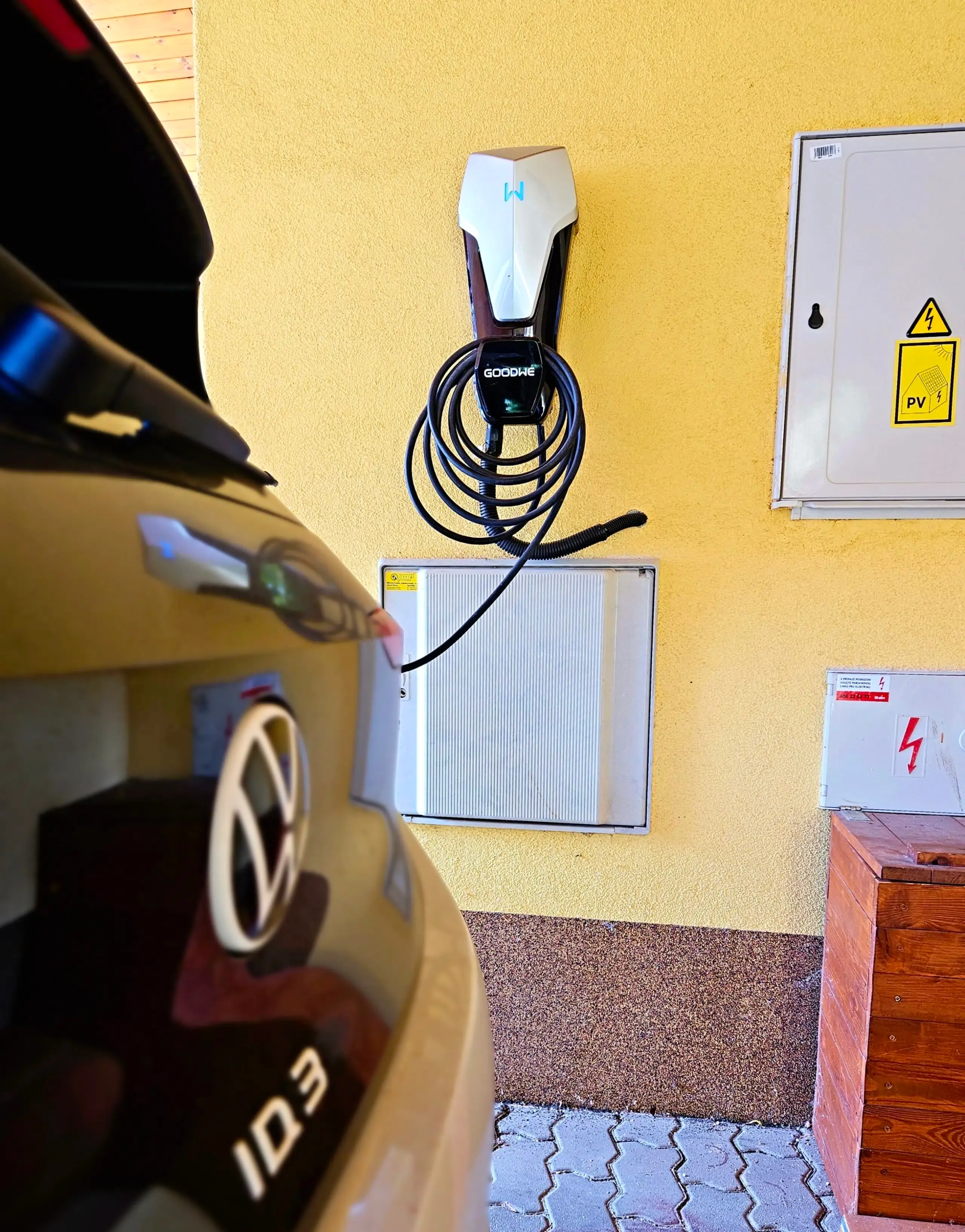 Nabíjecí stanice na elektromobily značky GoodWe k hybridní FVE na rodinném domě v Kuřimi.
