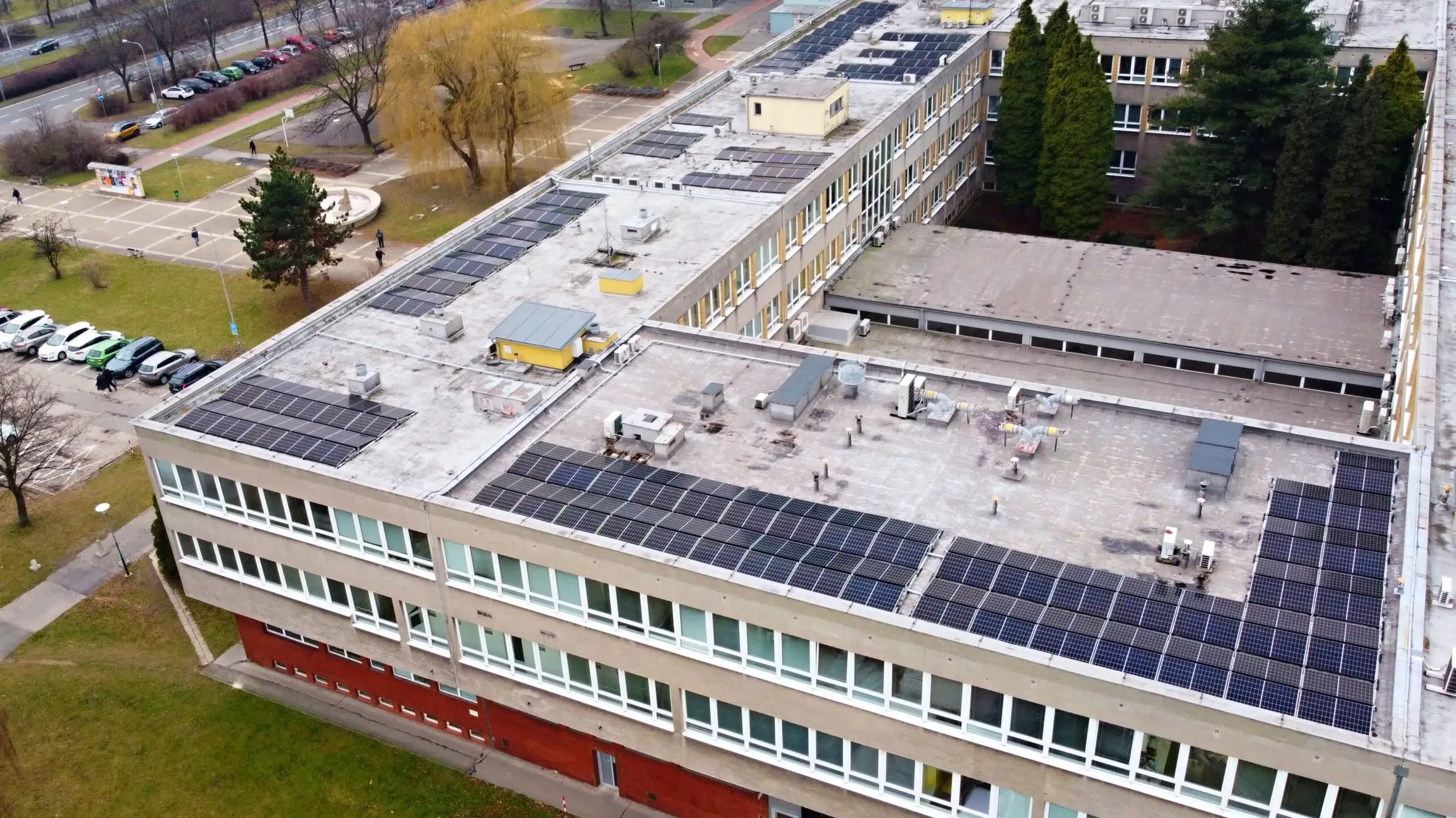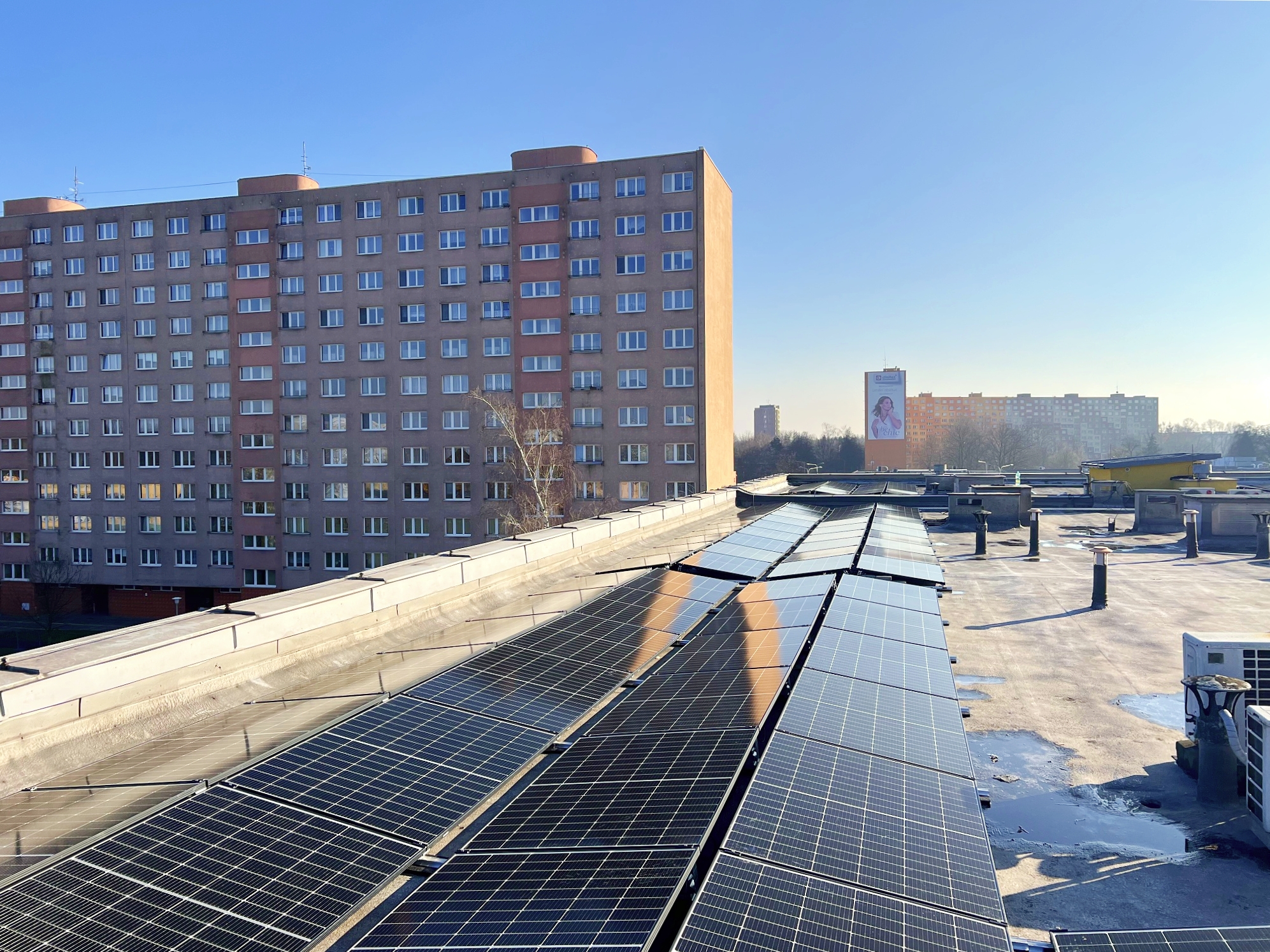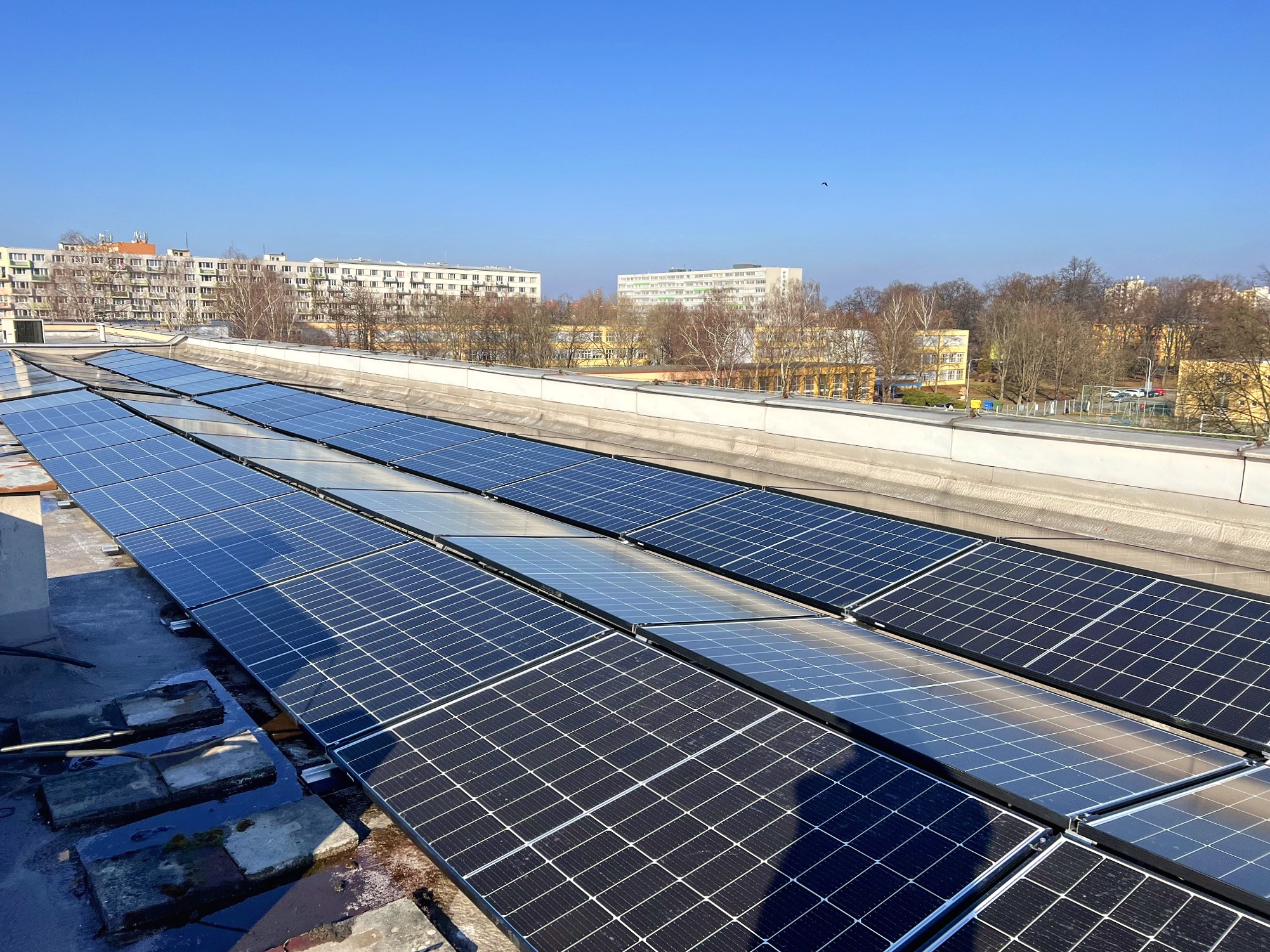 Hybridní FVE na střeše zdravotnického zařízení v Ostravě-Hrabůvce o celkovém výkonu 96,39 kW a kapacitou akumulace 103 kWh. Instalované panely jsou značky Suntech Power, baterie značky Alpha ESS.