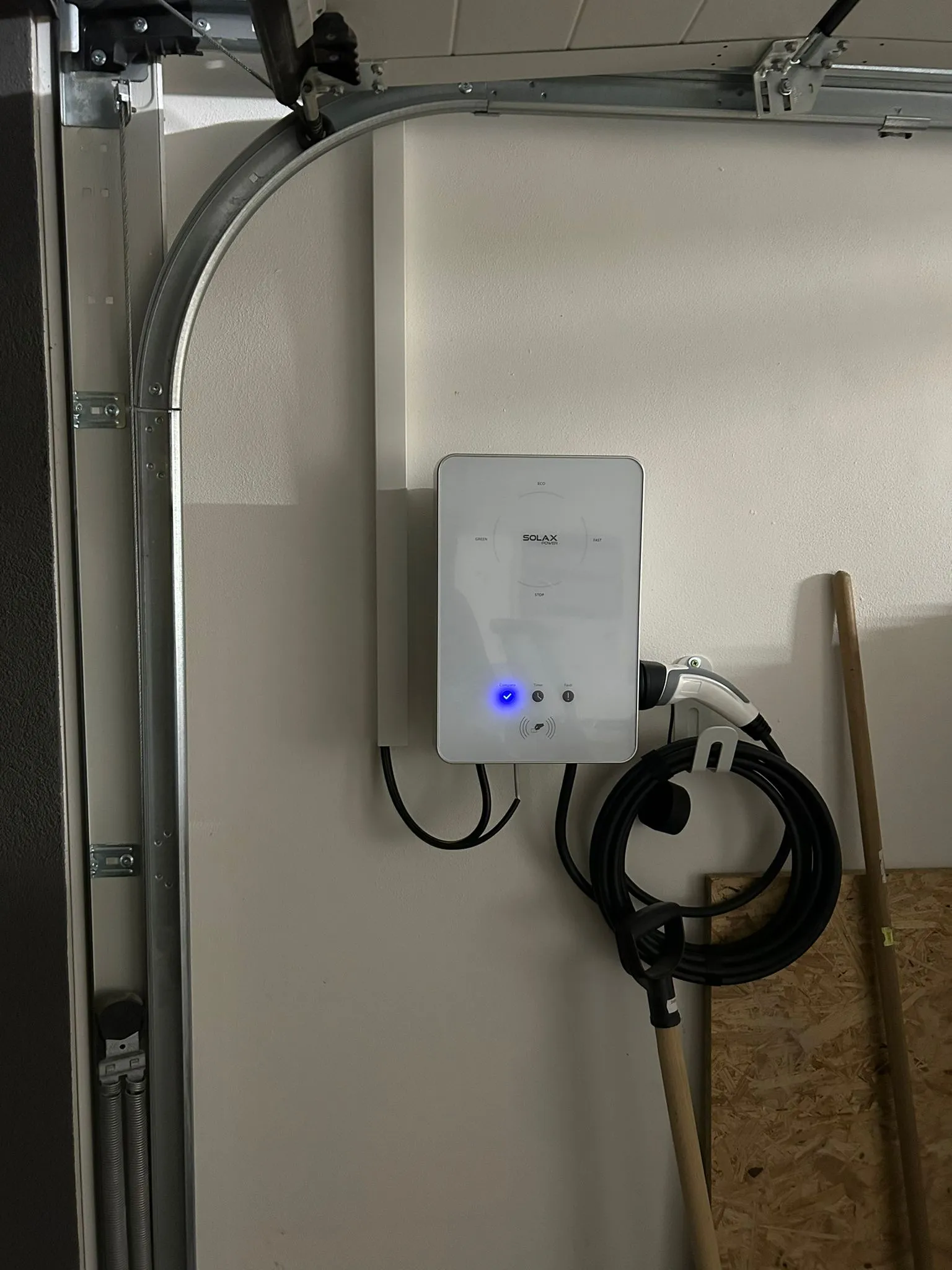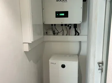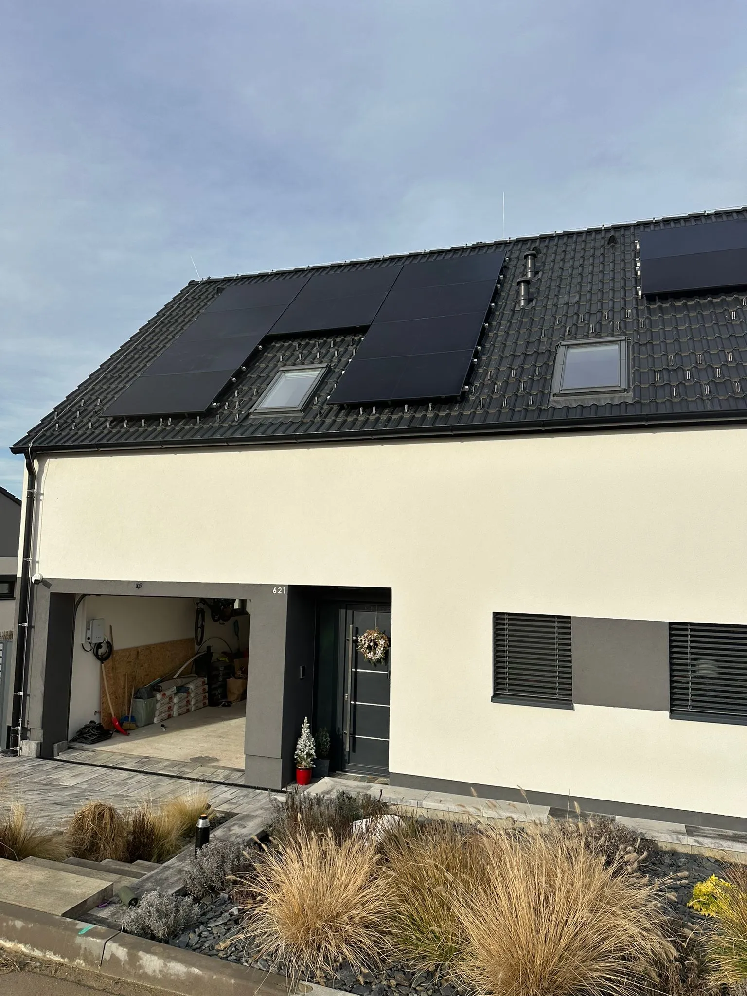 Hybridní FVE s na střeše rodinného domu v Bořeticích. Instalované panely o celkovém výkonu 9,9 kWp jsou značky AIKO, použitý střídač, EV charger a baterie s kapacitou 11,6 kWh značky SolaX.