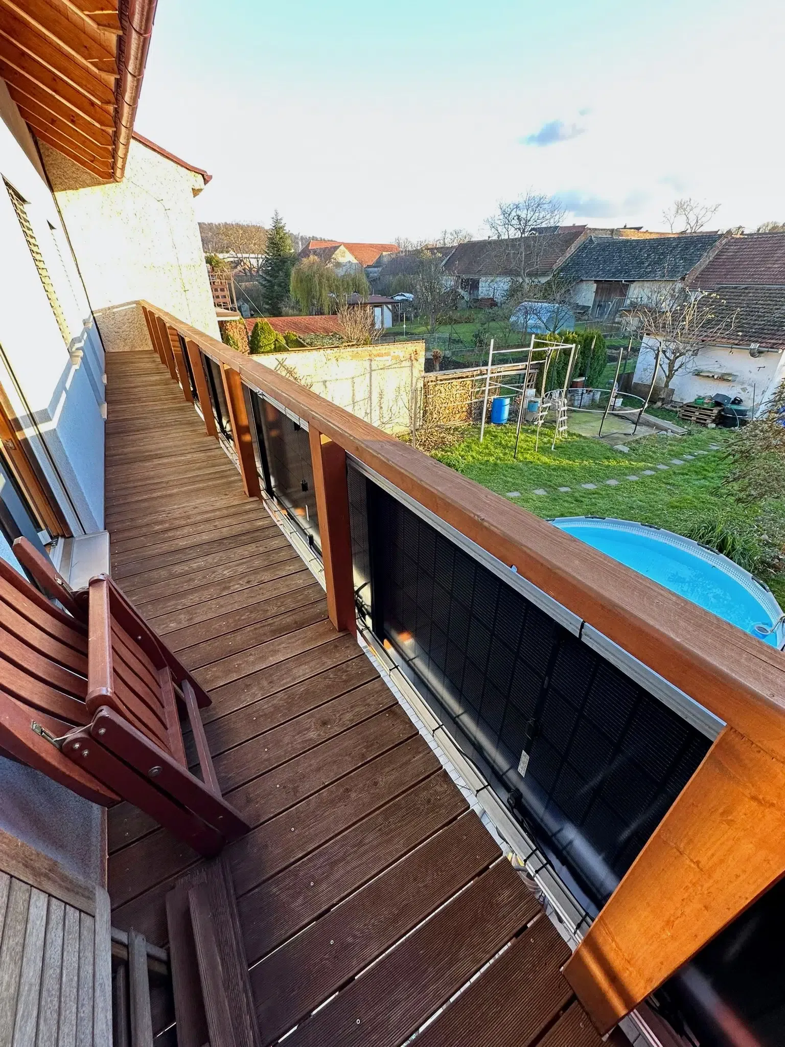 Hybridní FVE na střeše a zábradlí balkonu rodinného domu ve Veverské Bítýšce o výkonu 13,02 kWp a kapacitě akumulace 17,4 kWh. Instalované panely jsou značky AIKO, baterie a střídač značky SolaX. Elektrárna je optimalizována technologií Tigo.
